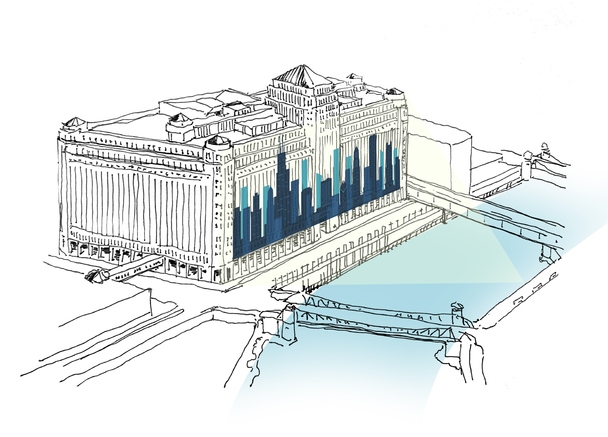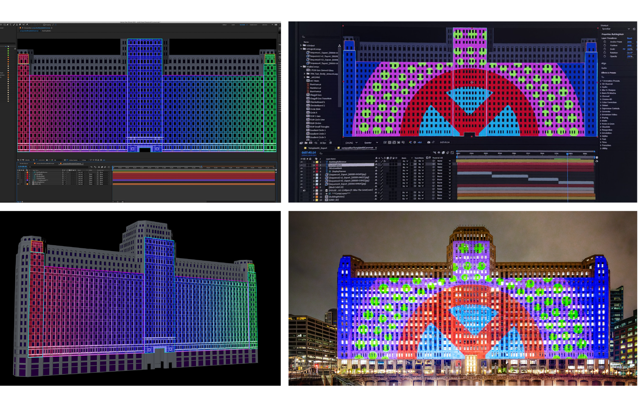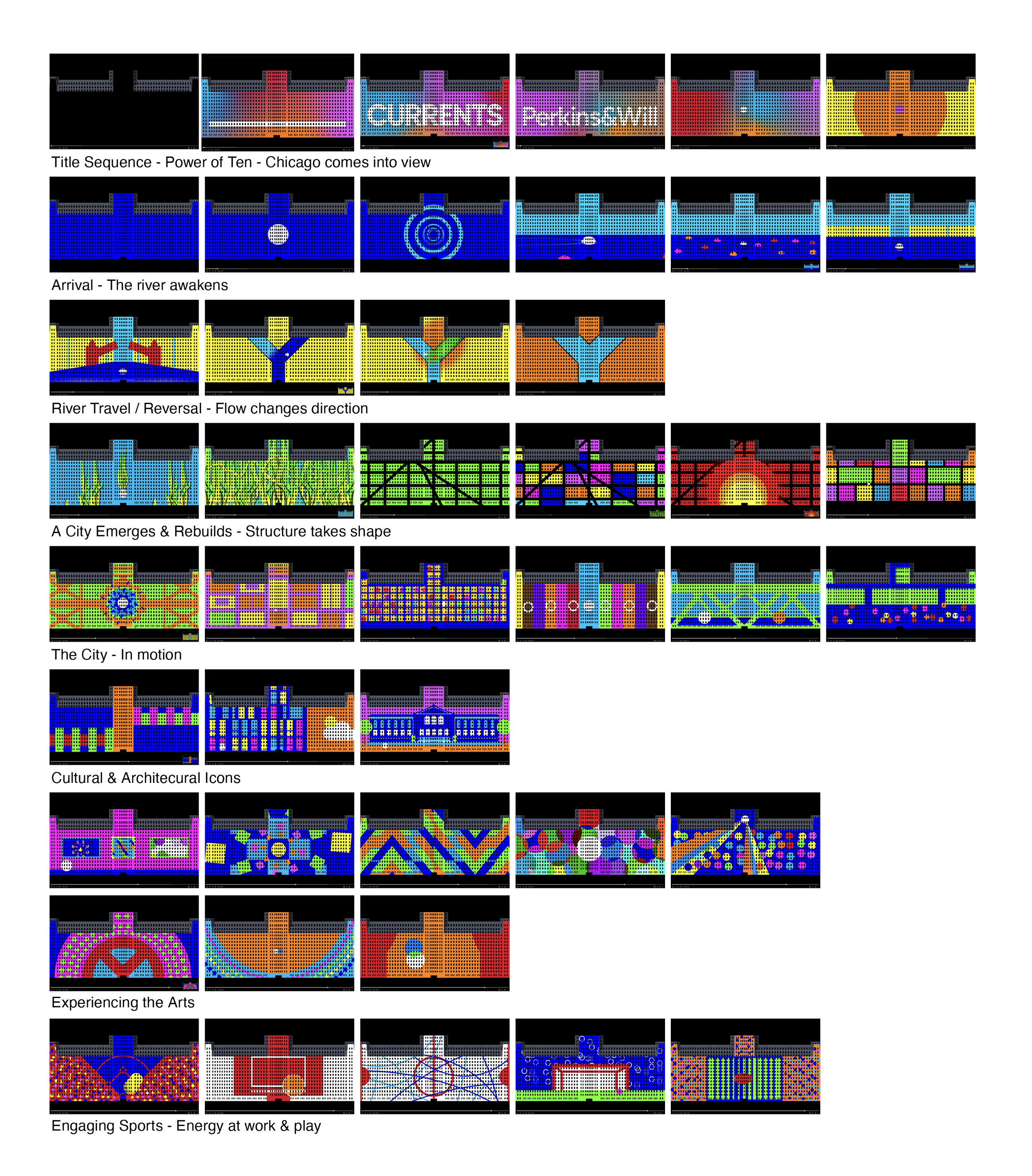 Currents of Chicago is a public art installation projected across the 2.5-acre façade of THE MART. The 9 minute animated piece follows a single animated dot as it travels through the story of Chicago using Bauhaus-inspired design and energized by the beat of Chicago House music.